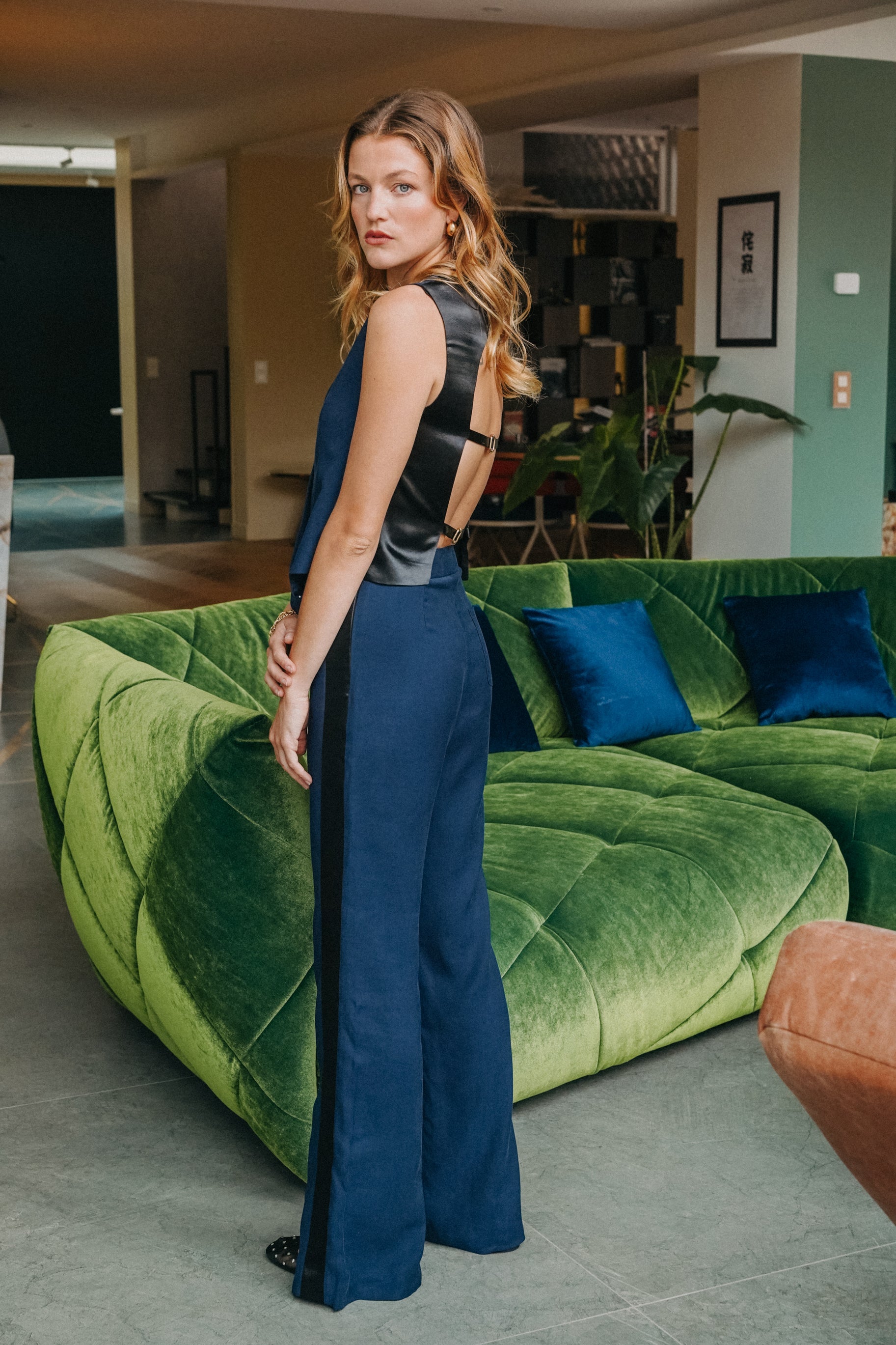 ♡ Jeu de matières contrastées entre un tissu bleu mat et une texture satinée pour une touche d’originalité.